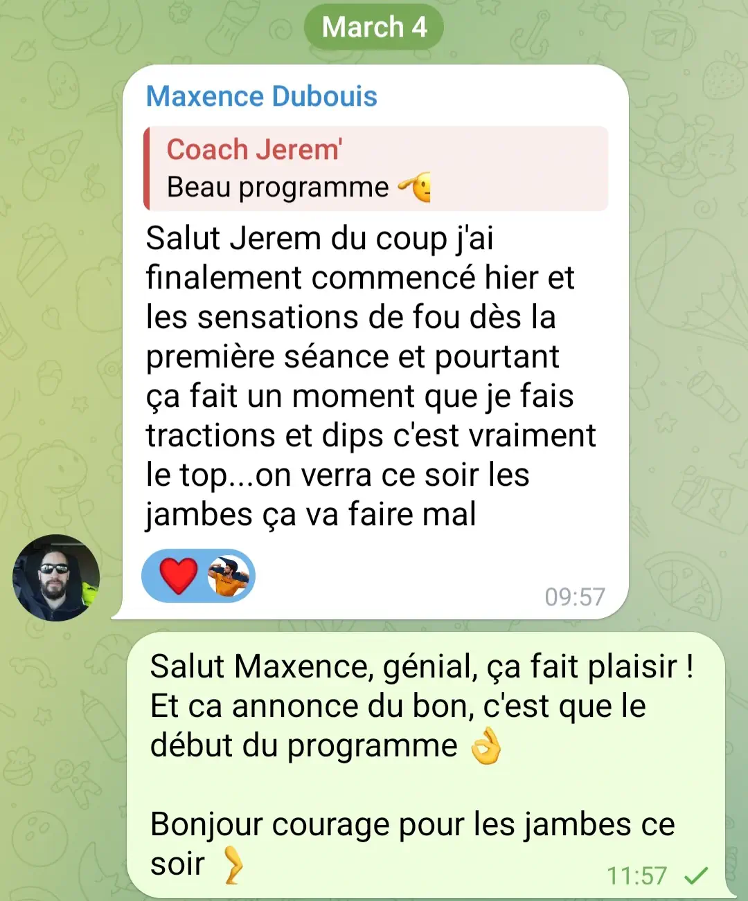 Je te recommande grandement la possibilité de réaliser des tractions également, mais je te proposerai des alternatives si ce n’est pas possible (toujours !)