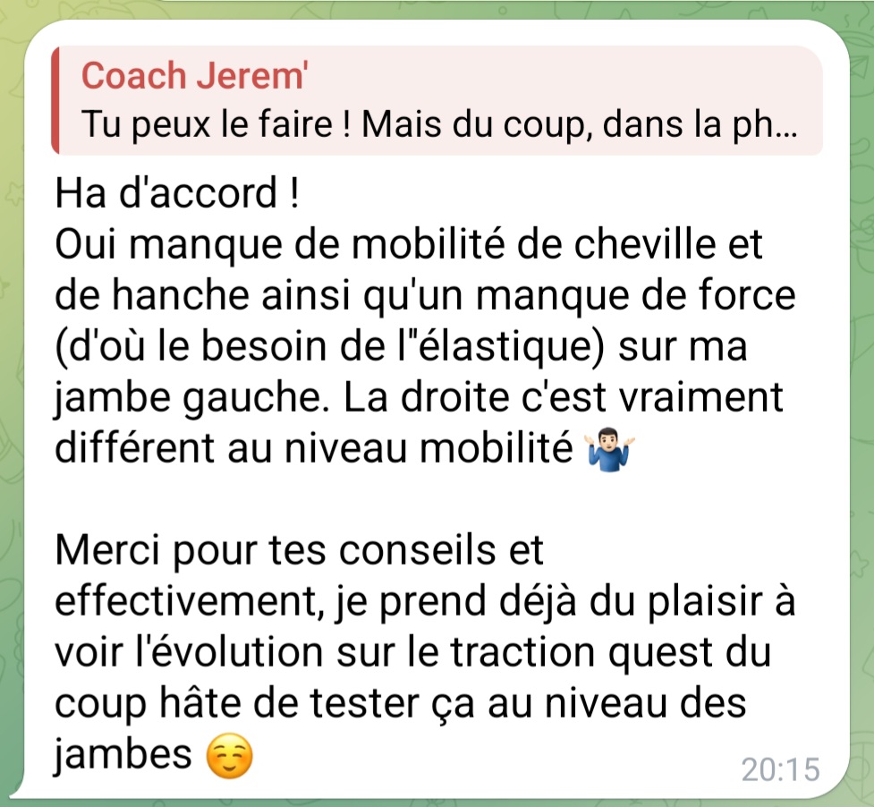 Puis j'ai mis en place mon propre système d'entraînement et de progression, au poids du corps + élastiques.